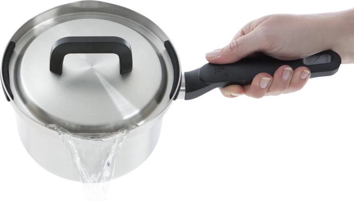 De pannen uit de BK Q-linair Flow pannenset – 4 delig beschikken over een veilig afgietsysteem waardoor je gemakkelijk en veilig je pannen kunt afgieten. Met een simpele kwartslag draai, vergrendel je het deksel onder de zwarte siliconen stoppers. Zo kun je op een veilige manier met twee handen afgieten. De steelpan kun je zelfs met een hand afgieten!