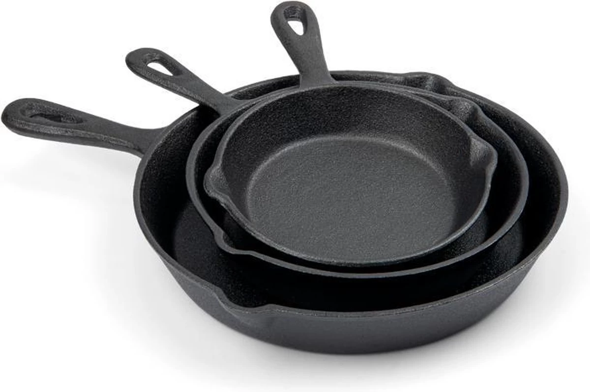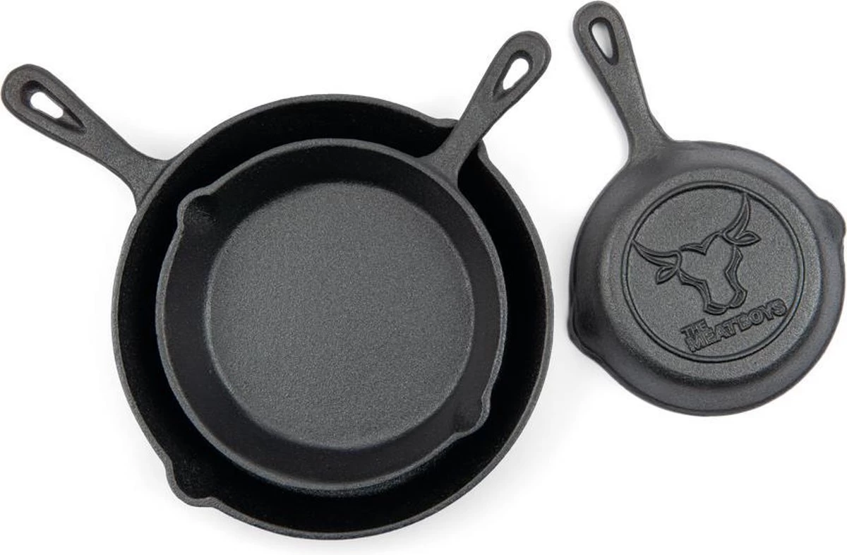 Op zoek naar een alleskunner voor op de barbecue of in de keuken? Zoek dan niet verder! The Meat Boys gietijzeren pannen, ook bekend als ‘Skillets’, zijn geschikt voor alle warmtebronnen en hebben een mooi design! Koken op een kampvuur in de tuin of op vakantie? Ook dat is geen probleem voor deze ijzersterke alleskunner. Wij hebben een mooie set gemaakt, bestaande uit drie verschillende formaten pannen (van 6, 8 en 10 inch)!