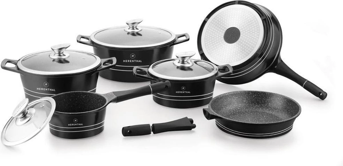 Herenthal Luxe Pannenset – 14-delig – Glazen Deksel – Inductie – Marmeren Coating – PFAS-vrij – Zwart – ES1014M