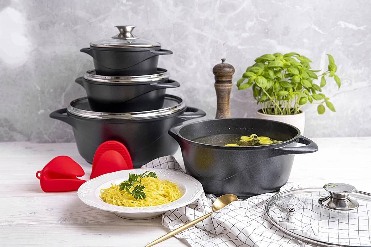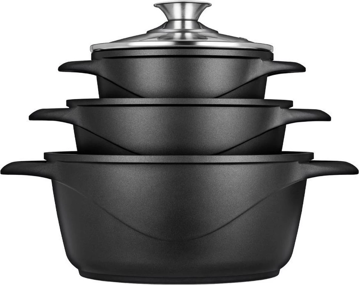 Deze prachtige pannenset van het merk Smile geeft iedere keuken een upgrade. De pannen zijn namelijk geschikt voor iedere kookplaat, waaronder inductie, gas en elektrisch. Ook wanneer jij switcht van huis of keuken kun jij deze pannen dus gewoon blijven gebruiken. Het zwarte materiaal en de glazen deksels zorgen voor een luxe en stijlvolle uitstraling, welke kleur jouw keuken ook is. Naast het mooie uiterlijk zijn de pannen ook nog eens van topkwaliteit; ze zijn allen voorzien van een anti-aanbaklaag, roestvrij stalen knoppen en dikke wanden voor een gelijkmatige warmteverdeling. De perfecte pannenset dus om in te koken, frituren, stoven óf braden.