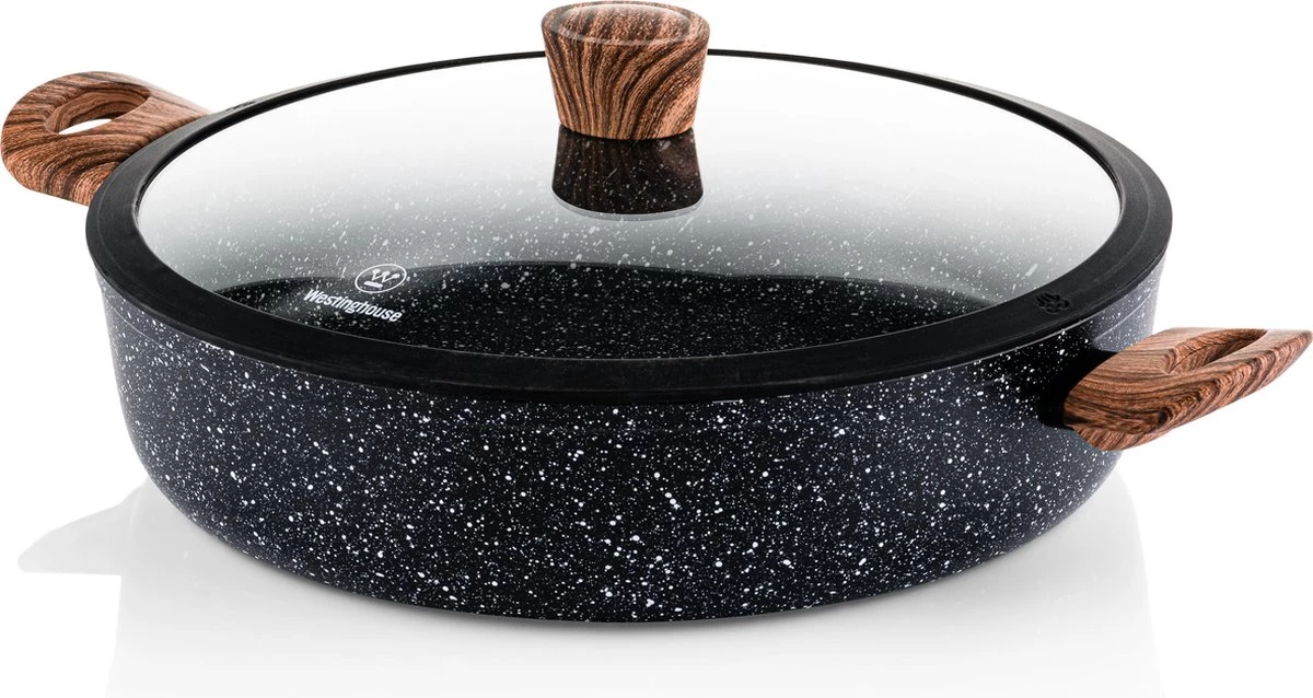 De Westinghouse Zwart Marmer Hapjespan Speciale Editie 32cm mag niet ontbreken aan jouw pannencollectie. De hapjespan is ideaal voor het bereiden van bijvoorbeeld eenpansgerechten, een lekkere risotto, paella of een heerlijke pastasaus. De pan is gemaakt uit aluminium en licht in gewicht. Zo verplaats je de hapjespan gemakkelijk van de warmtebron rechtstreeks naar de tafel.